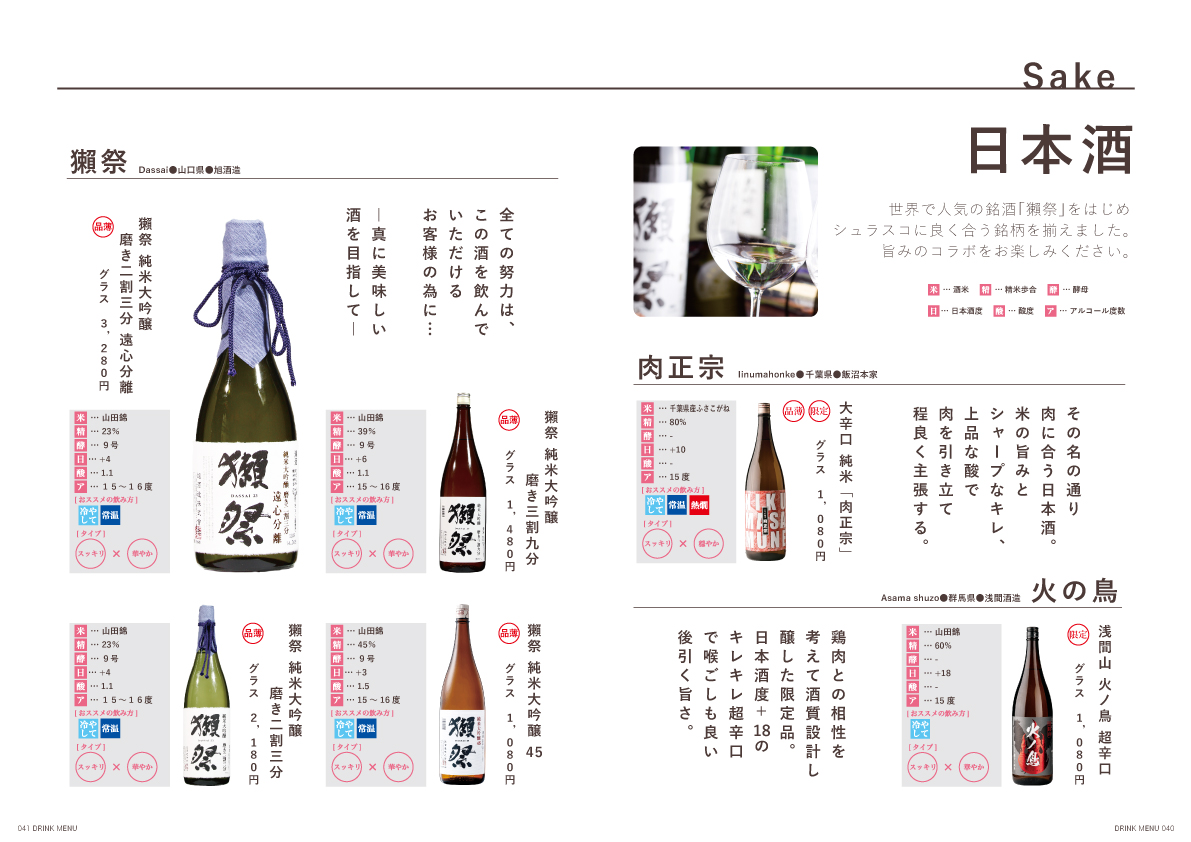 180CC ¥880~|Glass ¥1,280~|Small glass ¥380~|We have Dassai, Niimasa, Kubota, Hakkaisan, etc…